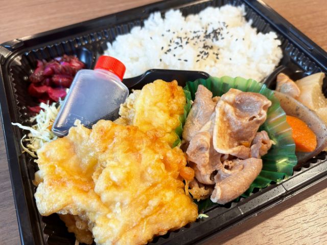 食欲を香りとポン酢の爽やかな酸味がたまらないお弁当です。特製のタレで焼き上げた生姜焼きは、ご飯が進むこと間違いなし。外はカリッと中はジューシーなとり天に、さっぱりポン酢が相性抜群。このお弁当で、1日を元気に乗り切りましょう!